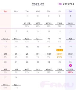 こちらは私がファムを始めた月(厳密にいうと1/31が初日ですが💦)に稼いだ報酬カレンダーです。